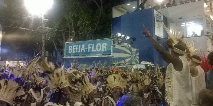 “São 41 anos [puxando o samba da Beija-Flor]. É um desafio muito grande. É um desafio também interpretar este samba, que os críticos apontam como o melhor samba deste ano. Mas vamos lá’, declarou o cantor, ao mesmo tempo que era ovacionado pelo público da arquibancada do setor 1, e chamado para posar para fotos. Neguinho procurou, na medida do possível, atender todos os pedidos.