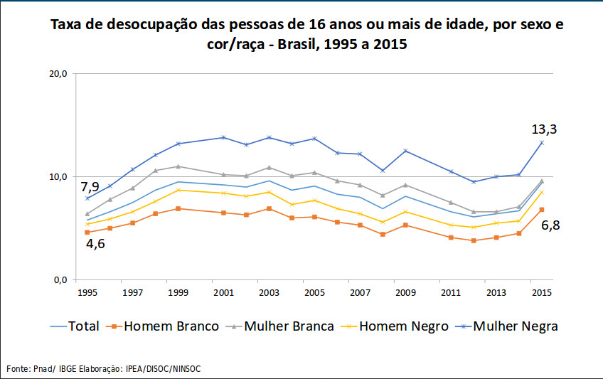 Denominado “Retrato das Desigualdades de Gênero e Raça”, o trabalho tem base em séries históricas de 1995 a 2015 da Pesquisa Nacional por Amostra de Domicílios (Pnad), do Instituto Brasileiro de Geografia e Estatística (IBGE). Divulgada na segunda-feira, 06 de março, a pesquisa faz parte de um projeto realizado pelo Ipea desde 2004 em parceria com a ONU Mulheres.