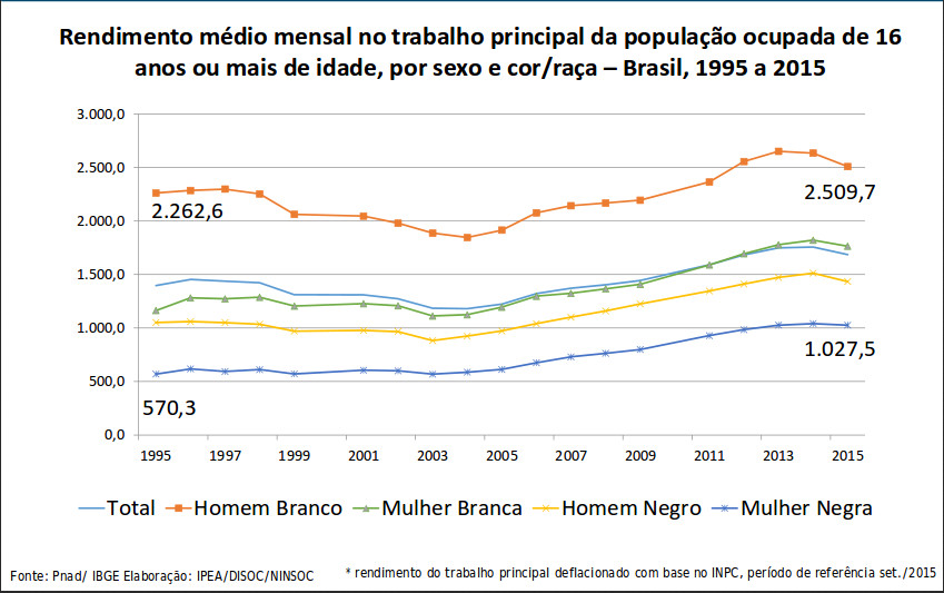 O estudo constata, por exemplo, que em 2015 a renda das mulheres negras cresceu 80% em relação a 1995, acréscimo bem maior que o do rendimento de homens brancos (11%). Mesmo assim, hoje um homem empregado recebe, em média, duas vezes e meia mais que uma mulher negra. Acompanhe a comparação no gráfico abaixo: