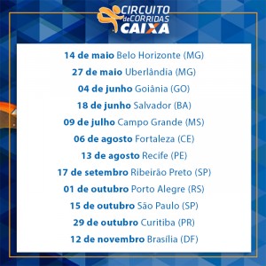 O Circuito Caixa está entre as mais importantes provas de corridas de rua do Brasil. Foi criado em 2004 e, neste ano, será realizado em 12 cidades diferentes. Confira: