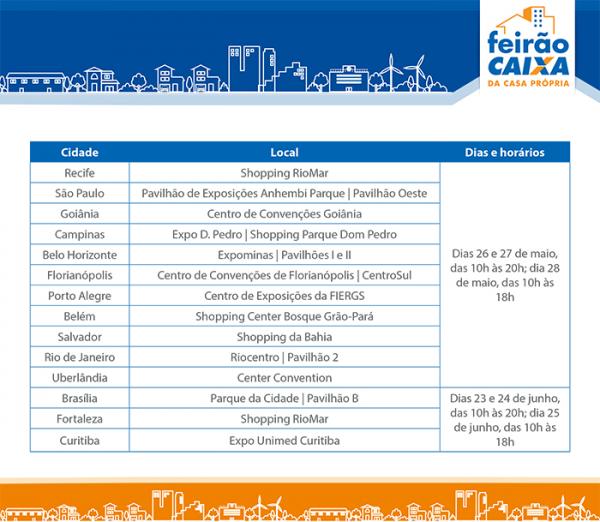 O feirão será realizado em dois fins de semana, entre os dias 26 e 28 de maio e 23 e 25 de junho. No primeiro fim de semana, o evento ocorrerá nas cidades de São Paulo, do Rio de Janeiro, de Campinas (SP), Belém, Florianópolis, Porto Alegre, Belo Horizonte, do Recife, de Salvador, Goiânia e Uberlândia (MG). No segundo fim de semana, o evento chegará a Brasília, Fortaleza e Curitiba.