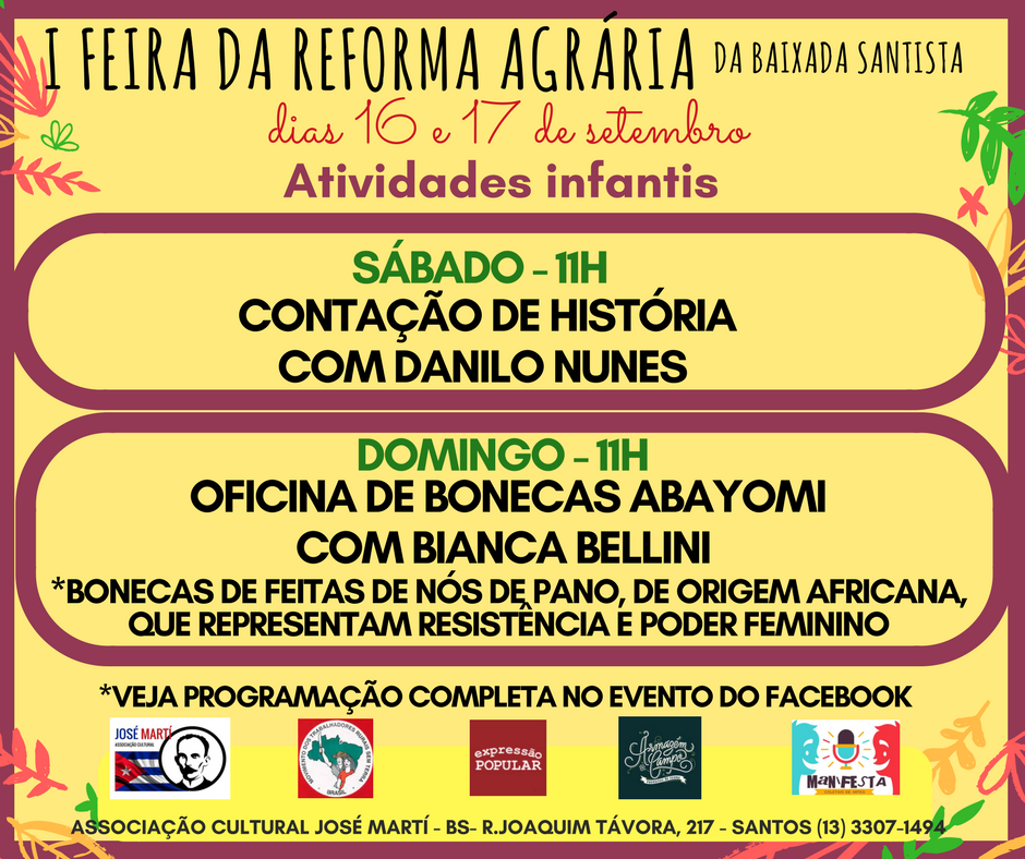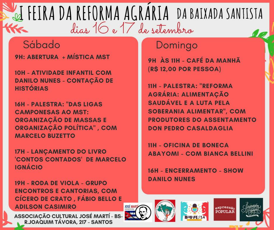 A I Feira da Reforma Agrária da Baixada Santos tem a promoção também da Associação Cultural José Martí em Santos, da editora Expressão Popular, do Armazém do Campo e da Manifesta.