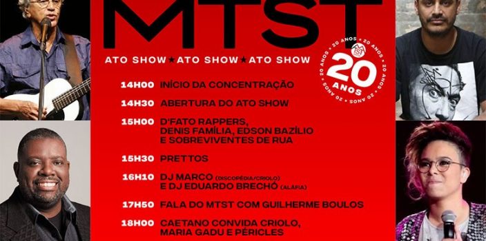 O Movimento dos Trabalhadores Sem Teto (MTST) comemora, neste domingo (10 de dezembro), 20 anos de existência. Para marcar a data, o movimento realizará um ato-show no Largo da Batata, zona oeste de São Paulo, com a presença de Caetano Veloso, Criolo, Maria Gadu e Péricles, entre outros convidados.