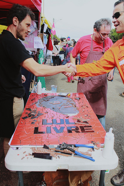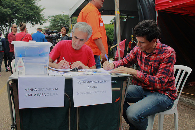 Uma das ações que mais mobiliza participantes é a “Cartas para Lula”. Uma banquinha foi montada para que as pessoas escrevam ou ditem cartas que estão sendo enviadas ao ex-presidente. Expressões de solidariedade, de reafirmação da lealdade; e principalmente palavras de agradecimento pelas políticas públicas que geraram inclusão social durante o governo Lula estão entre as mensagens mais recorrentes. Chama a atenção o interesse de crianças – e as cartas dos pequenos e pequenas estão entre as mais singelas.