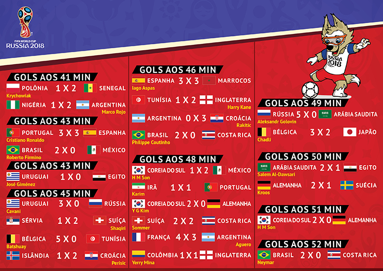 Os gols marcados na reta final de alguma partidas vêm garantindo doses extras de emoção neste Mundial da Rússia. Da primeira rodada e até o fim das oitavas de final, 25 gols, de um total de 146, foram marcados após os 40 minutos do segundo tempo (17% do total). Destes, 16 foram anotados já nos acréscimos do segundo tempo.