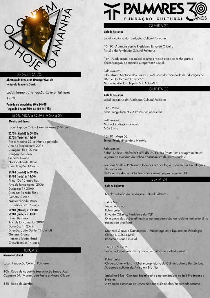 Local: Fundação Cultural Palmares (SCS Quadra 02, Bloco C, nº 256 – Ed. Toufic) e Espaço Cultural Renato Russo (508 Sul)