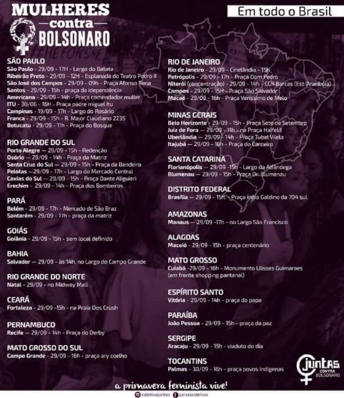 Em cidades em todas as regiões do país, e em várias partes do mundo, milhares de pessoas vão se reunir neste sábado, dia 29 de setembro, para protestar e mostrar resistência contra a ameaça fascista que ronda o Brasil.