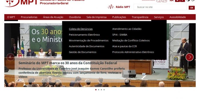 Imagem em destaque: reprodução da página inicial do MPT, indicando onde clicar para fazer denúncia