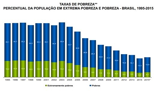De forma semelhante, percebe-se uma queda contínua dos níveis de pobreza e pobreza extrema no Brasil a partir de 2004, como resultado do Programa Bolsa Família e de outras políticas sociais voltadas à proteção dos mais vulneráveis, além do grande ritmo de criação de empregos no país. Esse movimento também é interrompido em 2015 pela adoção do ajuste fiscal [e o cenário piora com o golpe do impeachment de 2016].