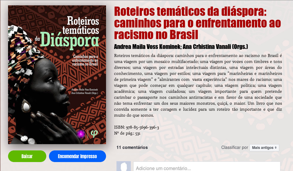 Baixe aqui “Roteiros temáticos da diáspora: caminhos para o enfrentamento ao racismo no Brasil”, organizado por Andrea Maila Voss Kominek e Ana Crhistina Vanali, da Editora Fi