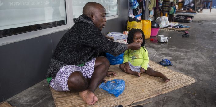 Imagem em destaque: Tome dá de comer a uma criança da sua família, Tereza. A família ficou sem casa depois do ciclone Idai. Foto: Unicef