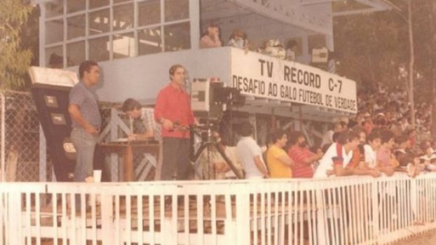Imagem em destaque: cabine de transmissão da TV Record nos anos 80 e torcedores lotando as arquibancadas. Reprodução TV Gazeta