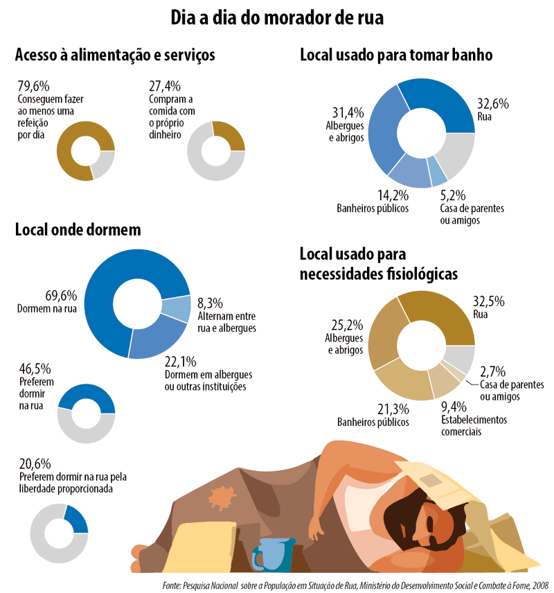 Por que não estão em uma casa; como fazem para comer, tomar banho, ir ao banheiro; como sobrevivem os moradores vivendo ao léu nas cidades brasileiras