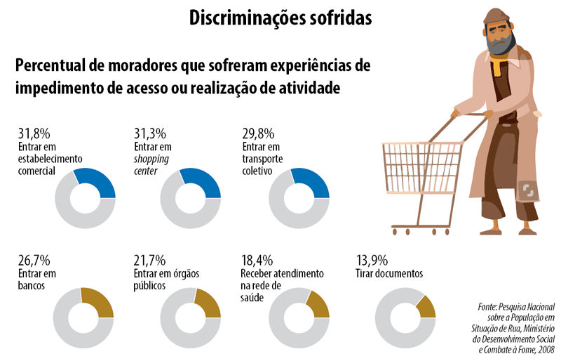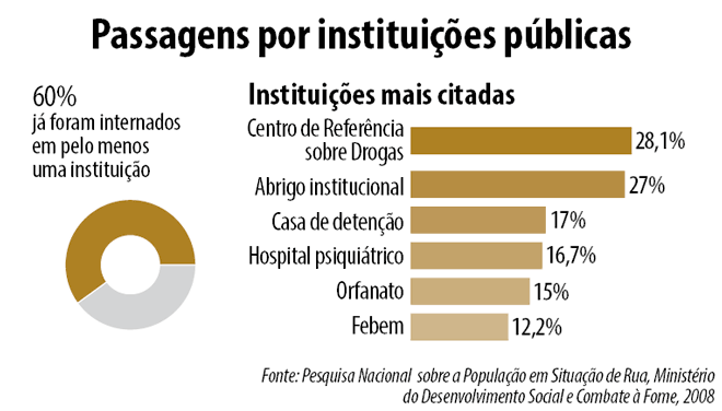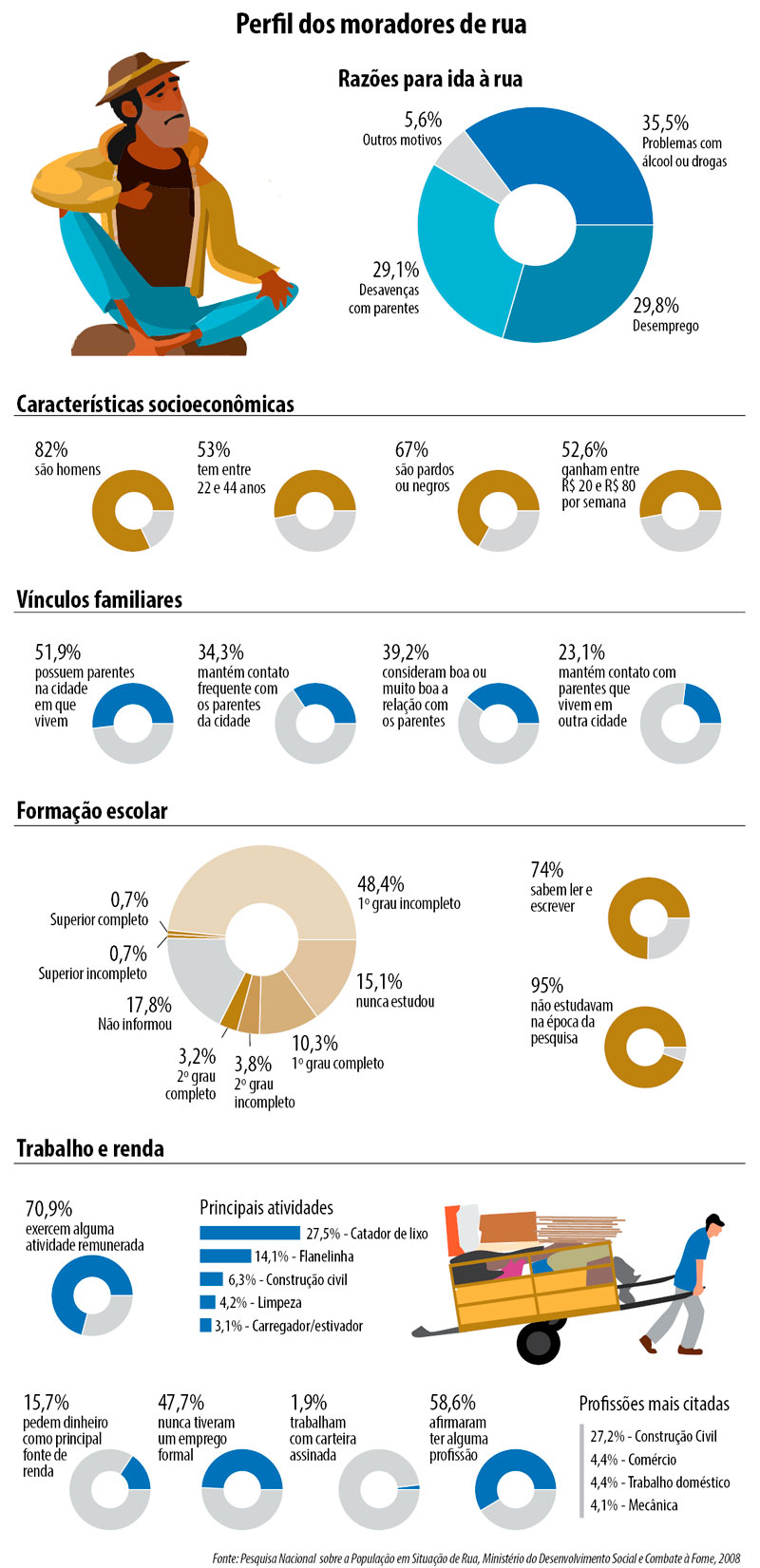 Constatou-se, entre outros aspectos, que 69,6% deles dormem na rua, 22,1% em albergues e 8,3% alternam entre a rua e os albergues.