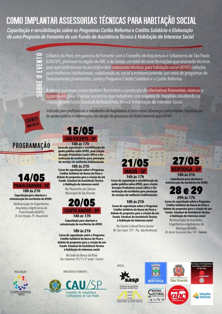 Com o objetivo de garantir o cumprimento da lei e de fazer com que mais famílias saibam como utilizar esse benefício ocorre entre esta semana e o fim do mês uma série de nove cursos em cidades da Baixada Santista e do ABC Paulista, promovidos pelo Banco do Povo e pelo Conselho de Arquiteura e Urbanismo, regional de São Paulo (CAU-SP).