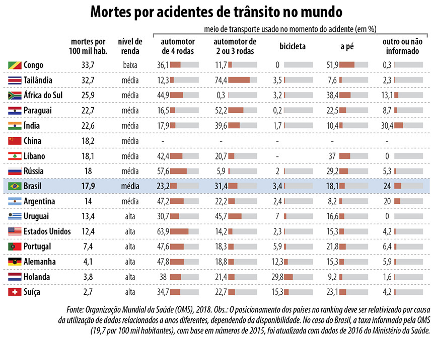 A seguir, gráficos da reportagem da Agência Senado com dados e informações sobre o trânsito no Brasil e no mundo: