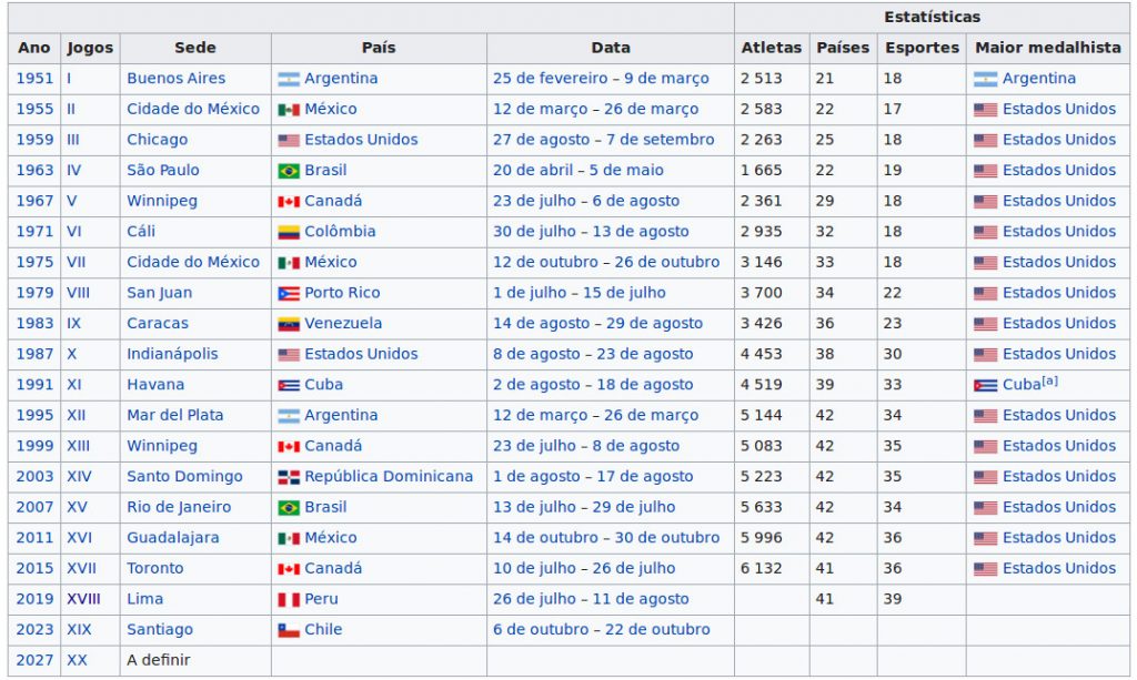 O Brasil já sediou os Jogos Pan-Americanos duas vezes: em 1963 (São Paulo) e em 2007 (Rio de Janeiro). Acompanhe as demais sedes e os países campeões em cada edição do Pan: