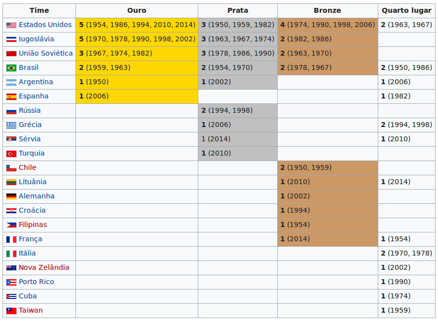 Além dos dois ouros em mundiais, a seleção brasileira soma duas pratas (1954, no Brasil, e 1970, na Iugoslávia), e dois bronzes (1967, no Uruguai, e 1978, nas Filipinas).