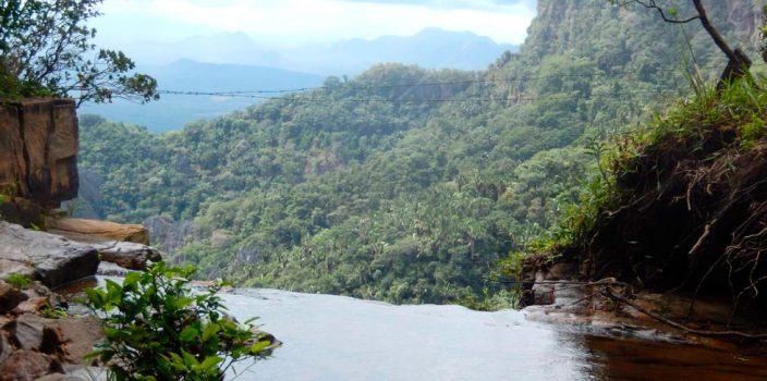 Olhamos para uma paisagem de serra, coberta de verde e água. Dá para imaginar o barulho da corredeira, os animais em volta; o céu que, neste dia, se prepara para as chuvas. Aqui é Ceará, Parque Nacional de Ubajara, região da Caatinga brasileira. A foto mostra um dos chamados “brejos de altitude”, ilhas de vegetação úmida que abrigam nascentes e servem de refúgio aos animais silvestres nos períodos de seca.