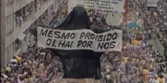 Imagem em destaque: o abre-alas da Beija-Flor proibido, denunciando a censura. Reprodução transmissão TV Manchete.
