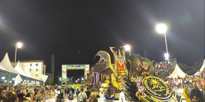 “Ayo, o senhor dos tambores” tratou das manifestações culturais com batucada. O último carro alegórico trazia um telão com imagens do arquivo da escola, em referência aos 35 anos de vida da agremiação do Marapé.