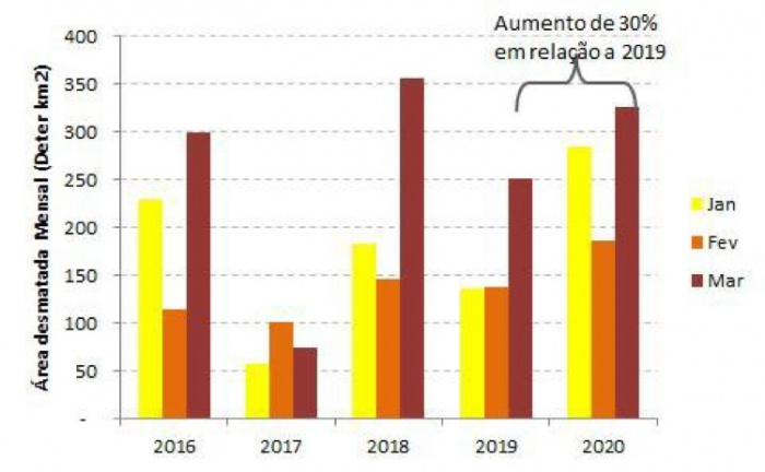 Ainda é cedo para se aferir qual será o impacto da chegada da pandemia do novo coronavírus sobre a floresta amazônica. Mas, neste ano, os alertas de desmatamento do Inpe, produzidos pelo Deter, aumentaram 50%, em janeiro, e 25%, em fevereiro, em relação aos mesmos meses do ano passado, mesmo antes do coronavírus. Em março, o aumento chegou a 30%.