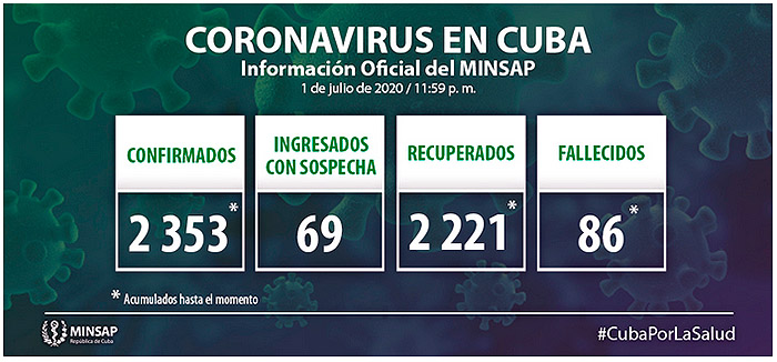 Desde o inicio da pandemia do novo coronavírus, em 11 de março, Cuba registrou até esta quarta-feira (1º) 2.353 casos de contaminação pelo novo coronavírus e 86 óbitos.