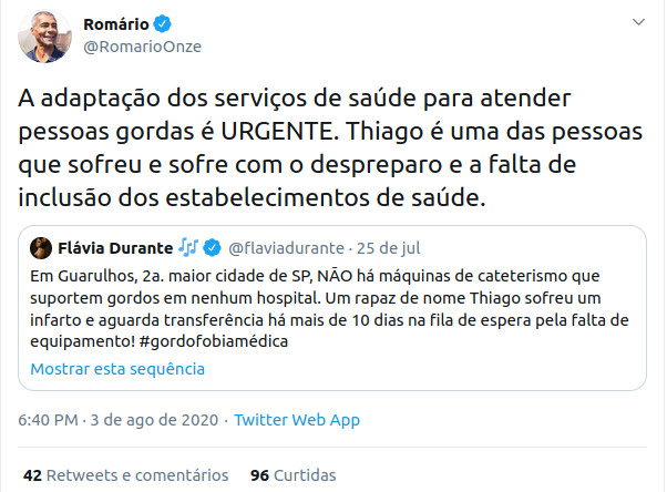 Comentando um twitter da jornalista Flávia Durante, fundadora da Feira de Moda e Cultura Pop Plus, em que relatou o que tem sofrido um paciente em Guarulhos, Romário lamentou o projeto ainda não ter entrado em pauta no Senado, e pediu apoio do público na pressão para que a proposta seja acelerada.