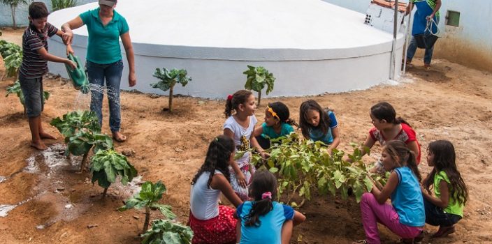 Imagem em destaque: crianças cuidam de horta, que compõem o programa de instalação de cisternas, em escola em Igaci (AL). Foto de Ana Lira/Asa Brasil