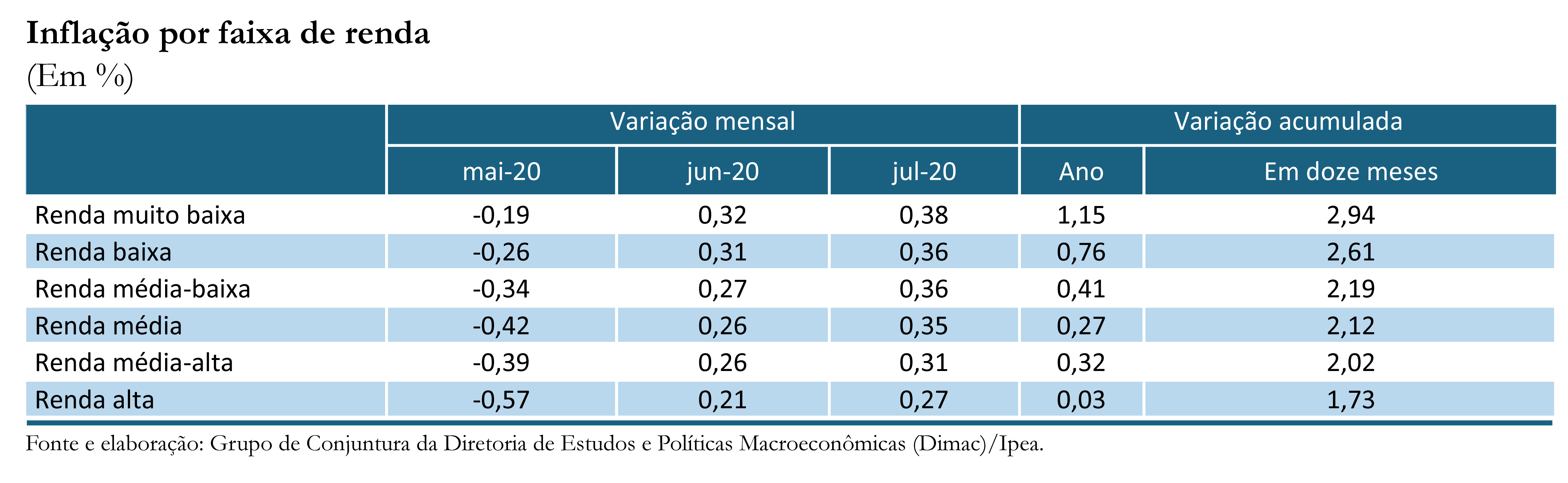 Pela tabela mais abaixo, vê-se que acumulado do ano, a inflação continua mais amena para as classes mais altas (0,03%), comparativamente aos segmentos de renda mais baixa (1,2%).