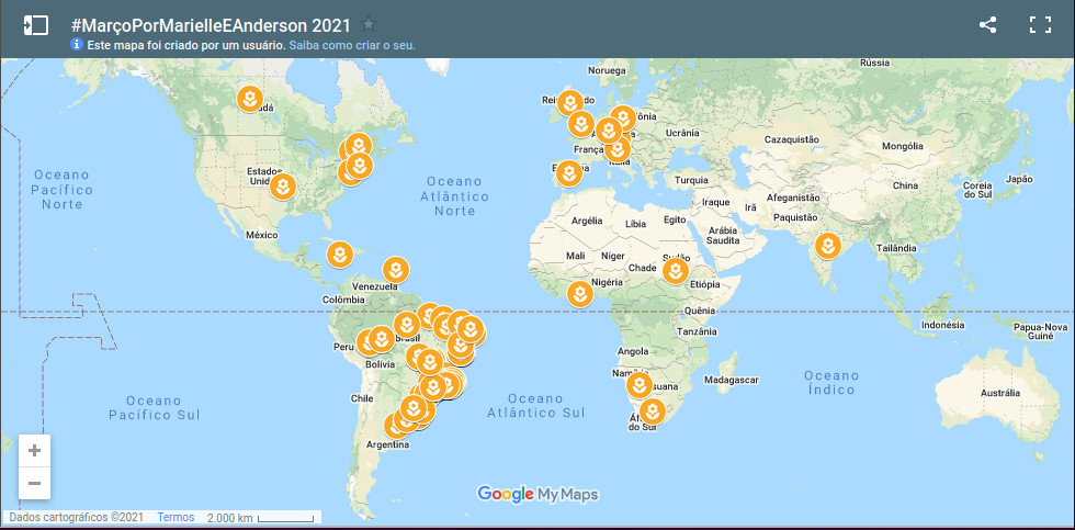 Confira no mapa abaixo as mais de 50 ações espalhadas pelo mundo (entre lives, debates, intervenções artísticas, ações simbólicas individuais e coletivas) já confirmadas, integrando a agenda “Março por Marielle e Anderson”.