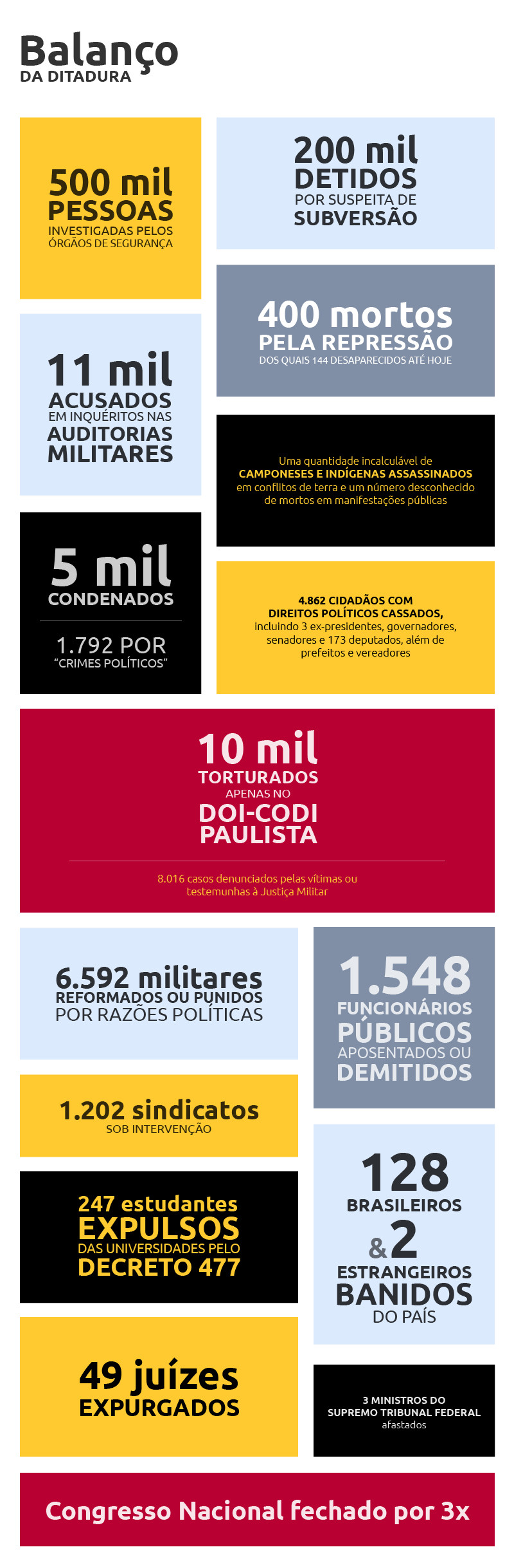 O Ato Institucional nº 1, de 9 de abril de 1964, que cassou os direitos políticos de uma centena de pessoas e os mandatos de 40 parlamentares, foi o primeiro de uma série de atos autoritários ilegítimos, que destruiriam a ordem jurídica, o Estado de Direito e o respeito aos direitos humanos fundamentais no Brasil da ditadura.
