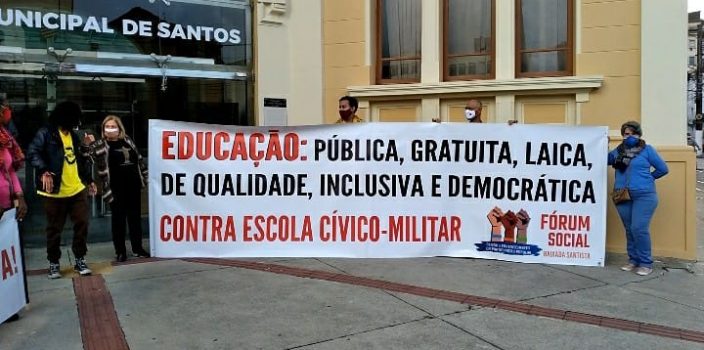 Imagem em destaque: ato na Câmara de Santos contra as escolas cívico-militares na educação básica. Foto: Apeosp