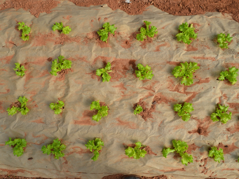 As plantas rendem mais, mas a eficiência no uso de água é ainda mais significativa. Para produzir um quilo de alface sem capina, o produtor gasta 43 litros de água. Com capina, 28 litros; com plástico, 21 litros e com papel reciclado, apenas 18 litros.