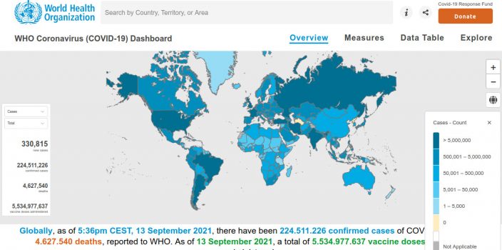 Imagem em destaque: mapa com estágio da pandemia no mundo, em 14 de setembro de 2021.
