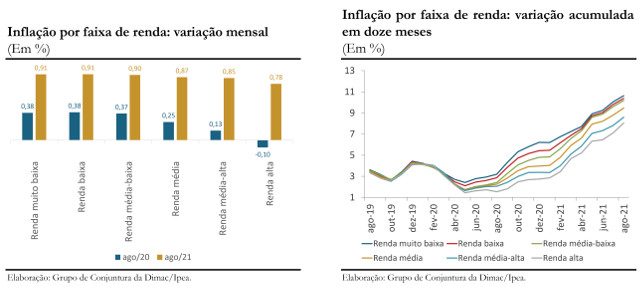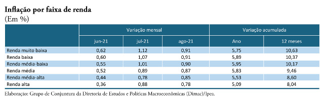 Você pode conferir o estudo na íntegra clicando em https://www.ipea.gov.br/cartadeconjuntura/index.php/2021/09/inflacao-por-faixa-de-renda-agosto2021/