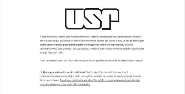 A pesquisa é conduzida pela professora Jaroslava Varella Valentova, do Departamento de Psicologia Experimental do IP, e o estudo é aprovado pelo Comitê de Ética em Pesquisa do Departamento de Psicologia da Universidade Swansea, que controla os dados do projeto.