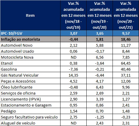 Enquanto o índice global registrou aumento de 9,57% em 12 meses, a inflação ao motorista chegou a 18,46% no mesmo período.