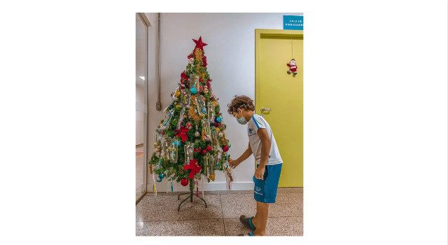 Imagem em destaque: criança se entretém com a árvore de Natal de escovas de dentes. Foto: UEL