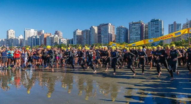 Imagem em destaque: largada para natação na edição de 2018 do Triathlon Internacional de Santos