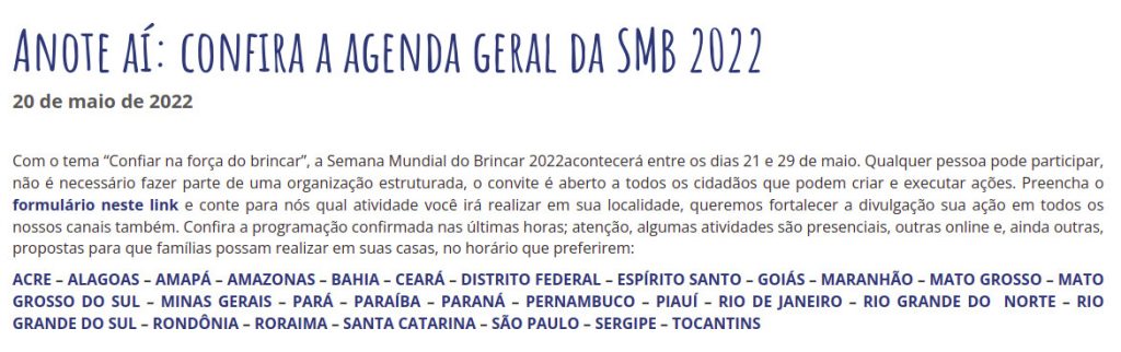 Com o tema “Confiar na força do brincar”, ocorre desde sábado, dia 21, e se estende até o próximo domingo, dia 29, a Semana Mundial do Brincar 2022.