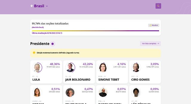 O site ‘Resultados’, do Tribunal Superior Eleitoral (TSE), permite com que cada cidadão e cidadã confira os números finais das eleições 2022.