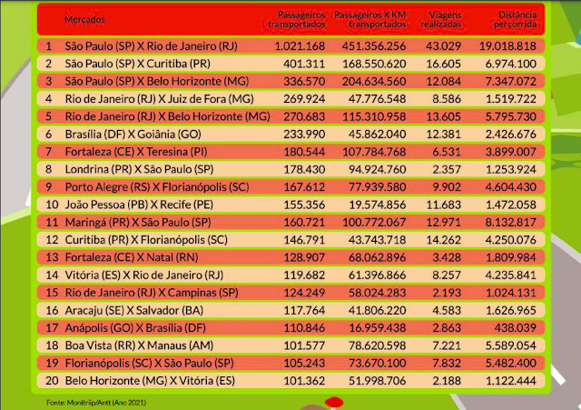 As 20 linhas interestaduais mais movimentados, de acordo com a Abrati