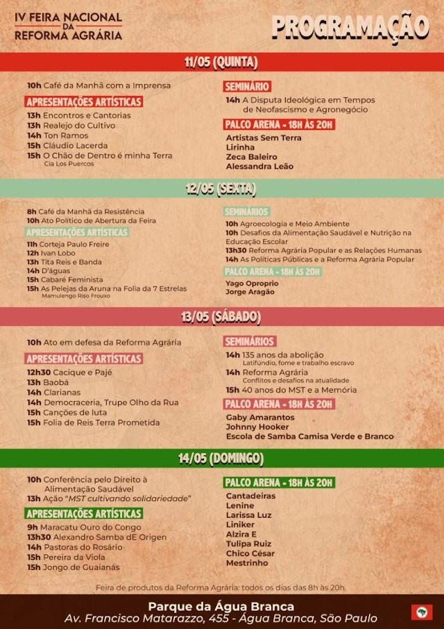 Todos os detalhes da IV Feira Nacional da Reforma Agrária, do MST, está nesta página especial: <https://mst.org.br/especiais/feira-da-reforma-agraria-2023/>.