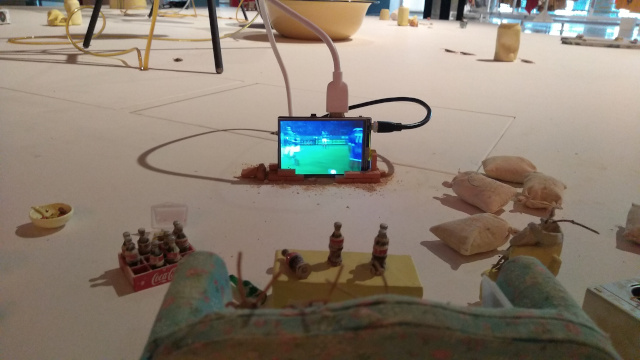 Por exemplo, um cenário que reproduz, em miniatura, uma sala de estar em que a televisão, transmitindo uma partida antiga de futebol, é o foco das atenções.