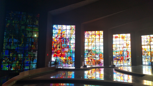 Desenhos representam elementos da geografia e cultura dos estados brasileiros. A luz do Sol sobre os vitrais causa um efeito imagético impressionante. O acesso é gratuito.