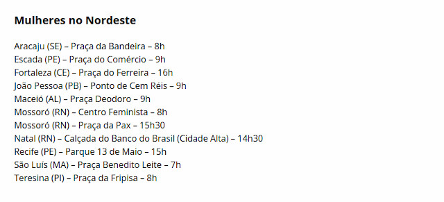 No Paraná, a Frente Feminista de Curitiba e Região Metropolitana e do Litoral promove atividades culturais na capital, a partir das 15h, na Praça Santos Andrade, no Centro. Às18h, haverá caminhada até a estátua de Enedina Alves Marques (primeira mulher negra a se formar em Engenharia no Brasil), na Boca Maldita, a partir das 18 horas.