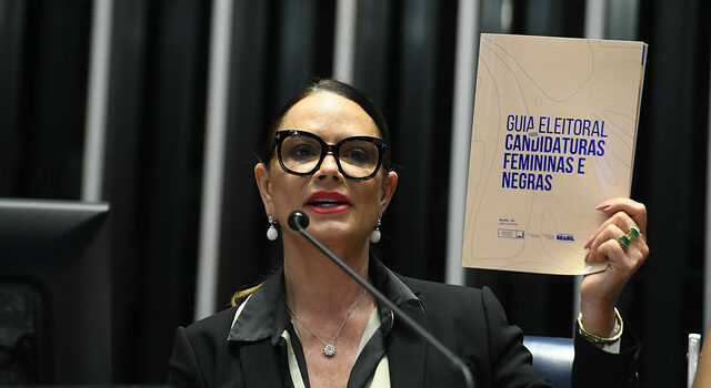 Imagem em destaque: em pronunciamento, no Senado, ativista do Instituto Nós Por Elas, Luiza Brunet, exibe o Guia Eleitoral para Candidaturas Femininas e Negras. Foto: Marcos Oliveira/Agência Senado