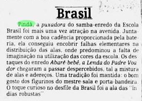 PINDÁ | A primeira escola de samba que eu conheci, eu tinha apenas 7 anos. Não desfilei, não, mas foi a primeira escola que eu conheci. Foi a Império do Samba. Depois, em 1974, eu comecei a sair na ala [dos indígenas], do falecido Hélio da Brasil. Eu comecei a sair nessa ala em 1974. Em 1977, eu comecei a cantar na Brasil, ganhando pela primeira vez, junto com meu primo Renival do Chapéu, o [concurso de] samba-enredo, para o Carnaval de 1978. Minha primeira aparição na avenida como interprete – não oficial, [mas sim] como intérprete da aula musical da Brasil – foi em 1978.