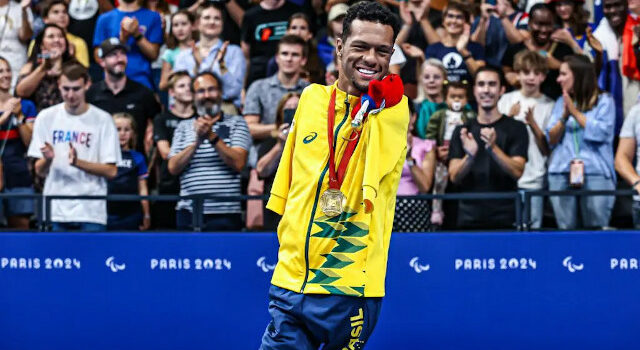 Imagem em destaque: Gabriel Araújo posa para foto em pódio em Paris 2024, após conquistar, na natação, o primeiro ouro para o Brasil nos Jogos Paralímpicos. Foto: Alexandre Schneider / CPB